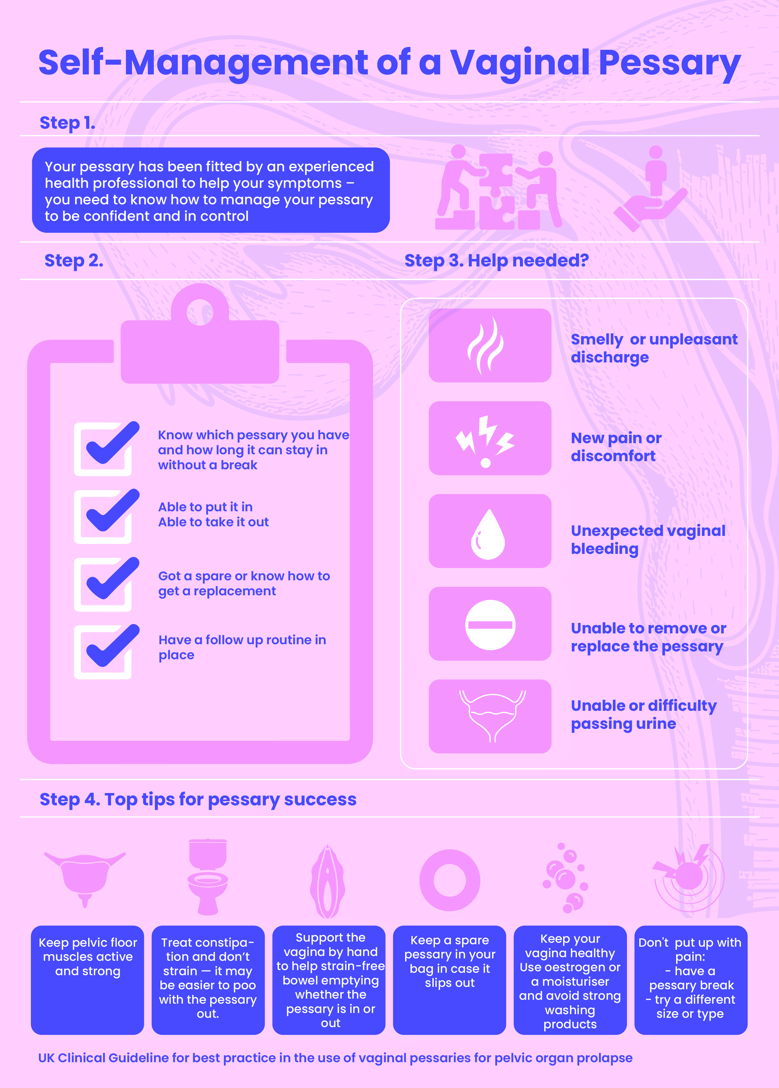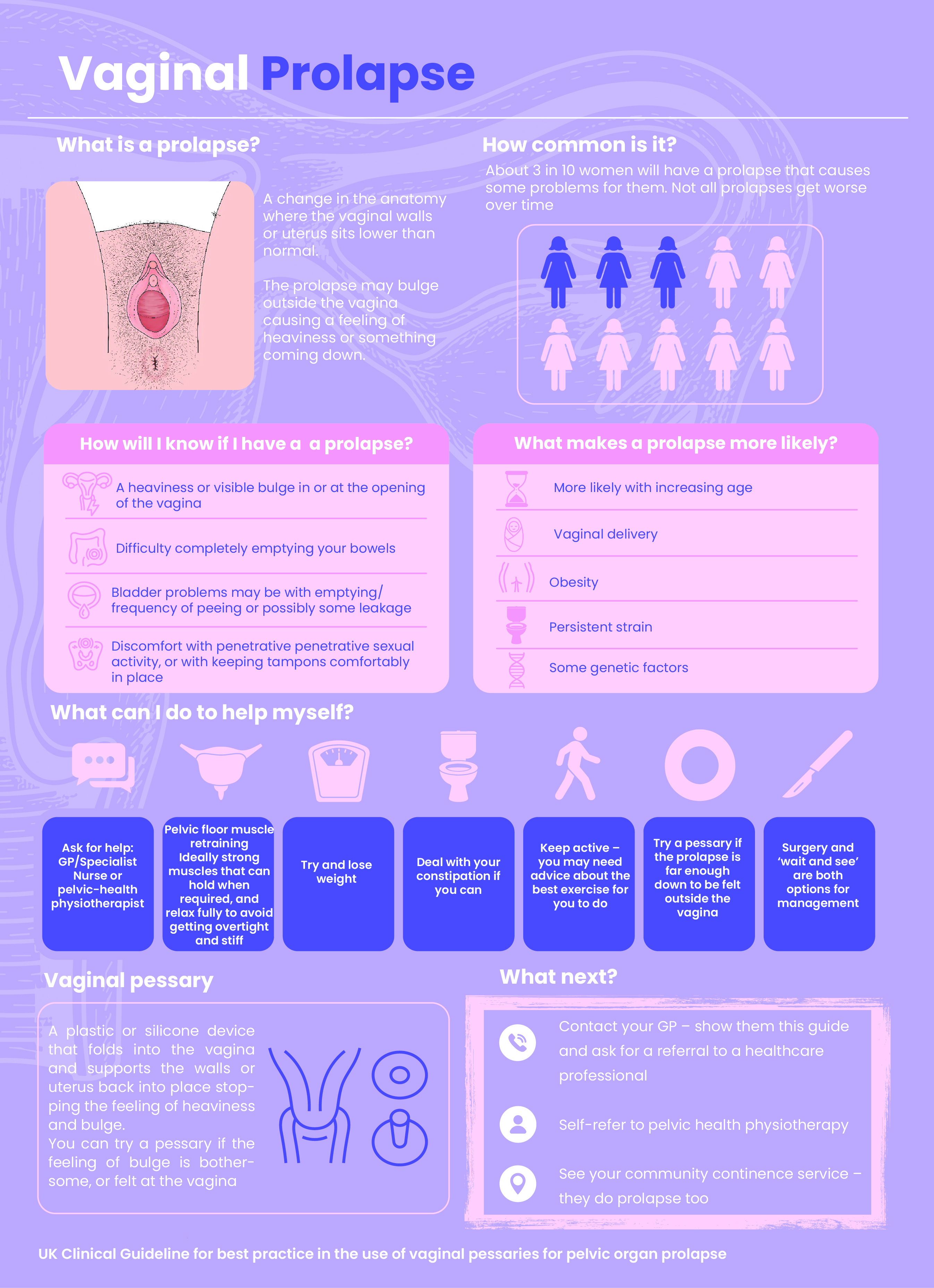 For patient-specific information, infographics, FAQs on pessaries and prolapse, please signpost patients to our dedicated patient webpages:
